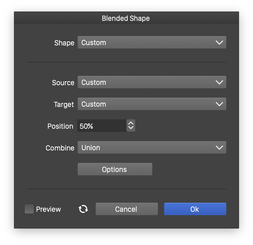 Blended shapes are shapes created from a single step blend of two other shapes. Blended shapes can link to existing object shapes or shape styles. The blending position of a blended shape can be adjusted in the Shape panel.