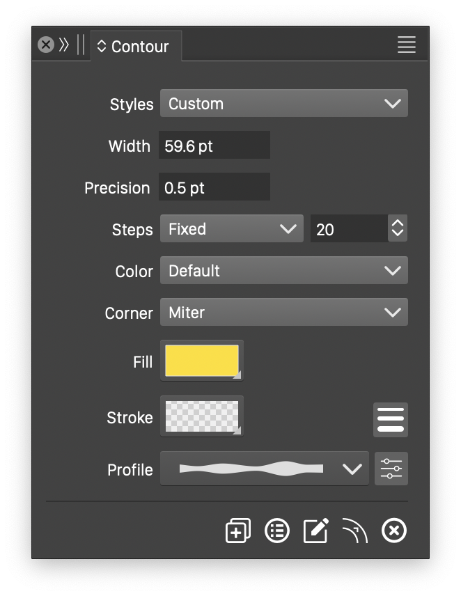 The Contour panel, opened from the Effects - Contour or the Panel - Effects menu, provides a quick access to the creation of contour effects, and common contour effect options. When a contour object is selected (the object containing the contour shapes), the contour panel will show the current options of the effect.