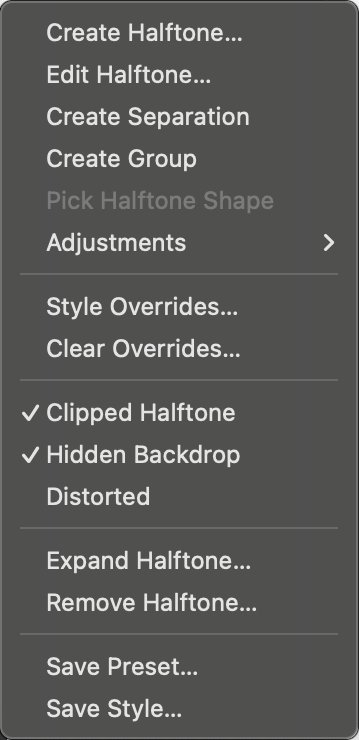 - Save Style - Creates a new halftone style, with the current halftone options. The halftone style can be reused in the current document, and changes to the style will be reflected in all instances of its use