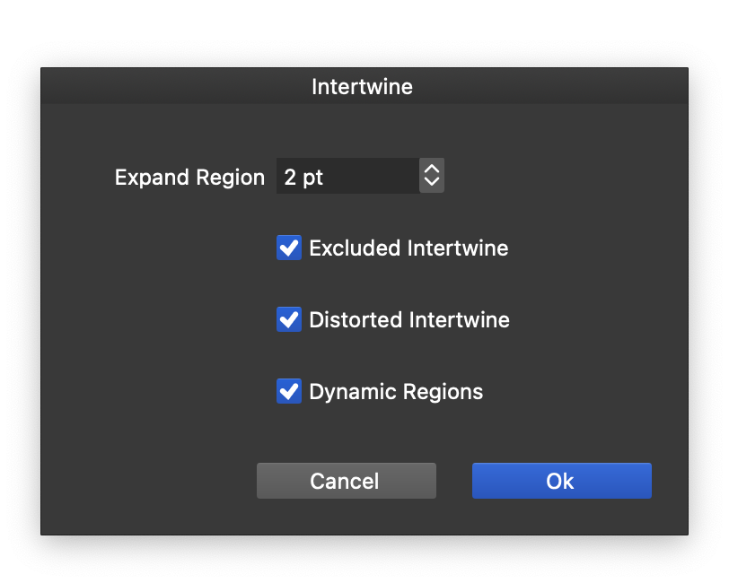 The intertwine group options can be edited by selecting the intertwine group, and selecting the Style -> Intertwine -> Intertwine Options menu. The following intertwine group options are available: