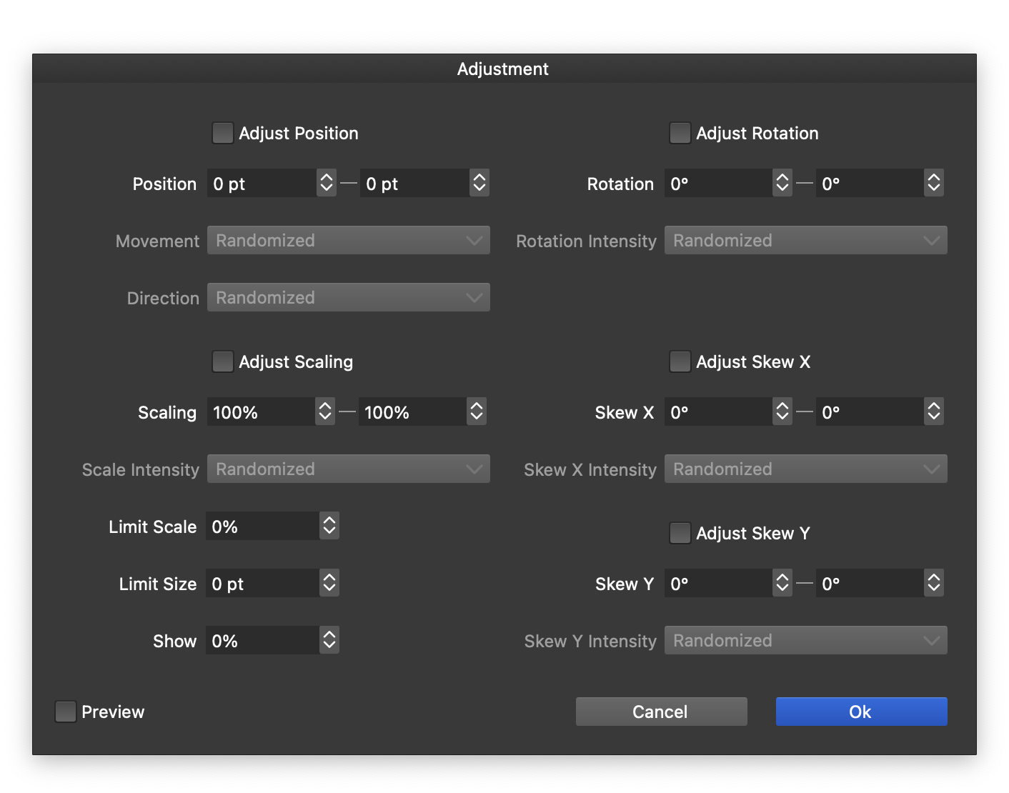 - Adjust Skew X/Y - Check to adjust the skewing of the resulting objects.