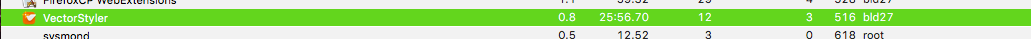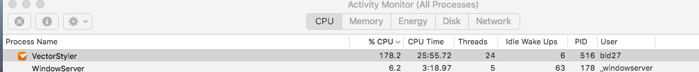 UPDATE: Each time I do a tracking a live font that has a grunge effect built in and has been warped, the CPU processing jumps way up and VS is very sluggish. After the task is over, it drops back down (second image from activity monitor)
