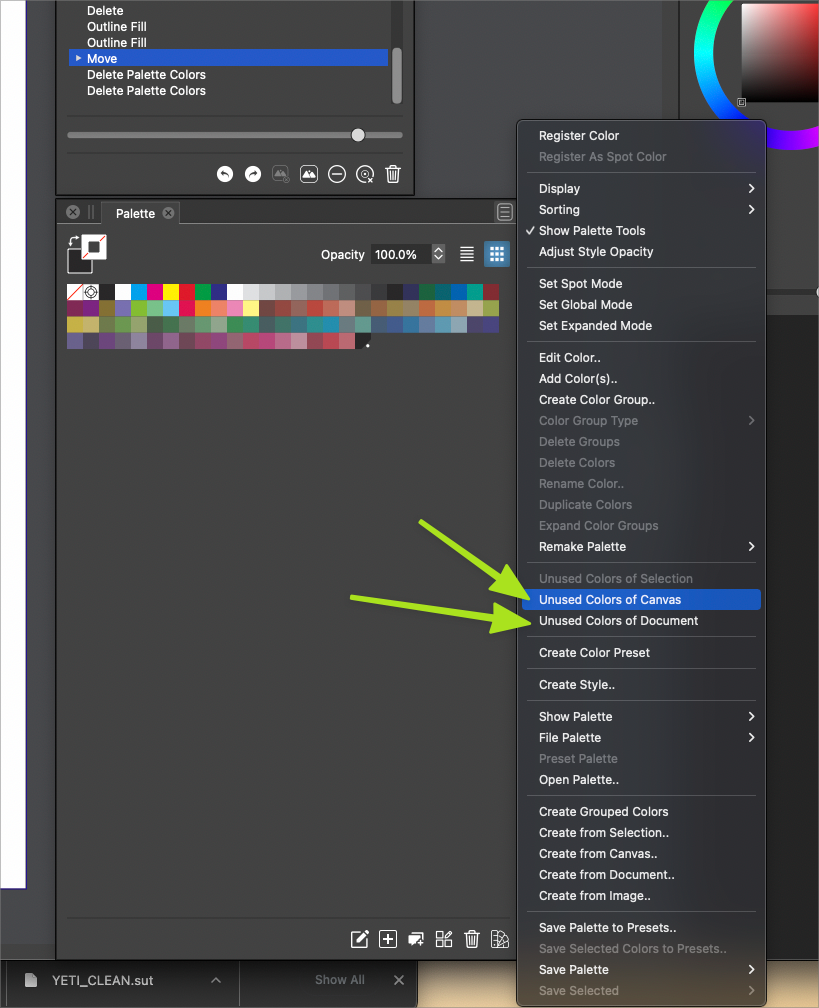 palette menu option to select all unused colors does not seem to be working - it selects all