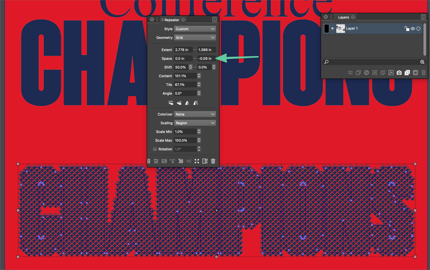 I'd also love an indicator or way to know when I've got the repeater subject perfectly touching the row below - this might be a little trickier with the offset grid. Right now I had to guess and get as close as I could