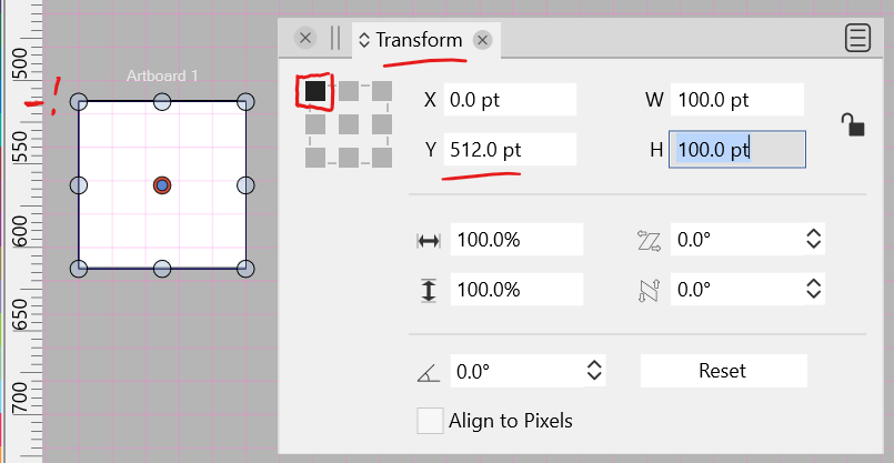 - Selecting the Artboard with the Artboard Editor Tool, accessing the Transform Panel, having the origin point set to the upper left, shows the artboard as being 512 pt. on the Y axis.