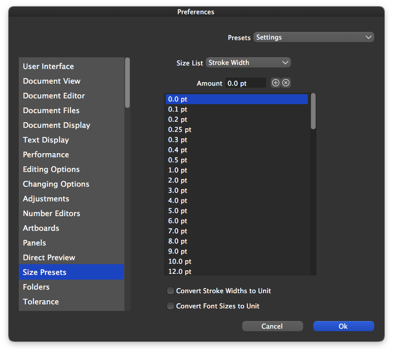 I know I was speaking to Csaba a few weeks back about the sizing for strokes, that it seemed to jump quickly to large sizes and skipped over the smaller ones. He mentioned I could go in to preferences an then size presets and add in the exact sizes I wanted. This is a great way to customize it and I've done that. Would it make sense to pre-set VS to already have some of those tiny sizes and fewer larger sizes by default? .05, .10, .15?