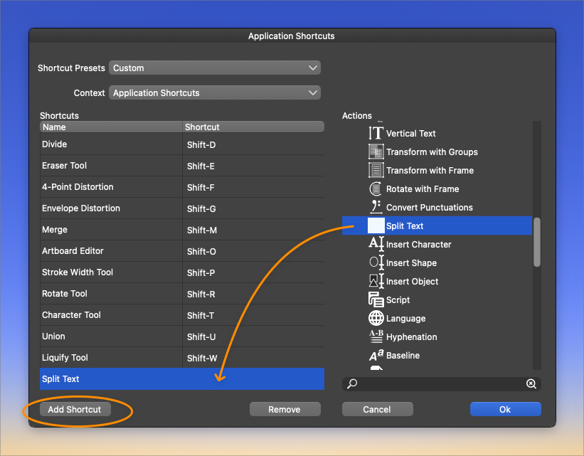 Using the Keyboard Shortcut panel today, it was not overly obvious the method to add new shortcuts to the master list. I naturally tried to drag in this example, the split text from the list on the right to the list on the left without success. I had also tried hitting the "ok" button but that just closed out the keyboard shortcut pref panel entirely. The "add shortcut" button was not the first thing I noticed, I think because it was on the far left and I was dealing with things on the far right - it did not feel like it belonged with the list on the right....