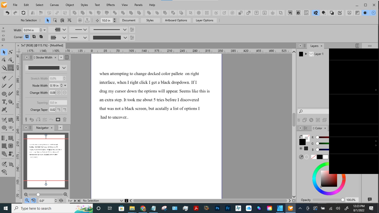 Also, the vertical color palette can be dragged (from the dots representing the title) to the bottom of the window, maybe the popup menu shows correctly.