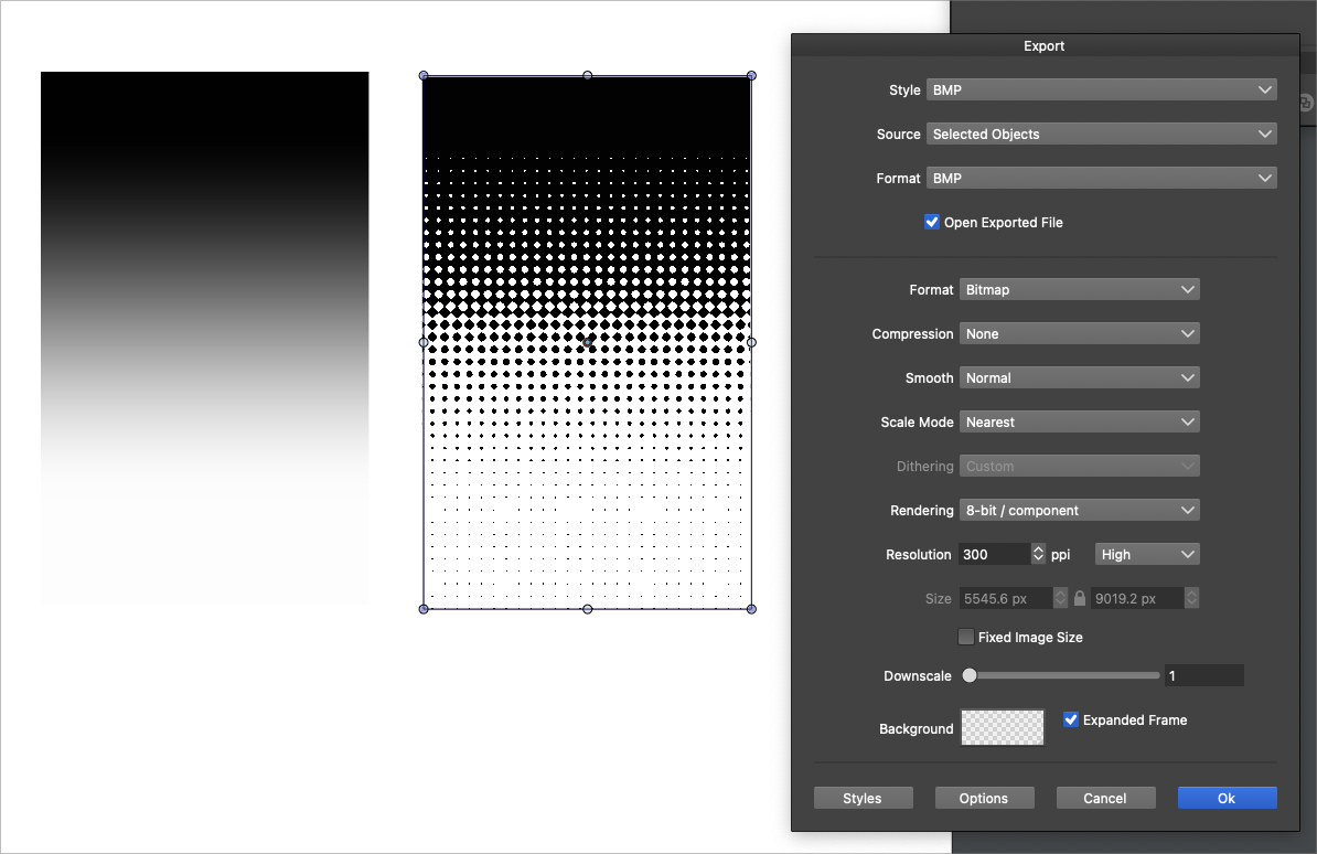When I made the source gradient, I initially made what is white, 0% opacity and left what is black at 100% opacity. All I wanted was what is black to be the bitmap and to essentially have a transparent background. This caused the black to also be less than 100% (the black itself ended up having a halftone pattern inside it) so I had to scrap that idea.By using 100% white and 100% black in the gradient fade eliminated the black itself from having a halftone in it, but now when I export it as a BMP, I am getting white and black in that result as shown in the image below. It also seems to have a lot of artifacts. How do I remove the white in the bmp and just have the black?