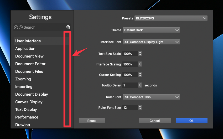 Also, I'm not seeing a scroll bar on the left side for the settings topics. I'd love to see that added in and only have it disappear if the panel has been enlarged enough to fit all topics listed on the left side in view