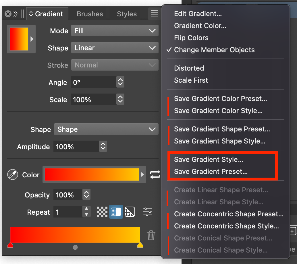 Notice that these menu commads always come in the order of first "Preset" then "Style" except for "Save Gradient Style" and "Save Gradient Preset". These seem to be backwards and break the "rhythm". I think they should be reversed so they will align with all the other saving options (eg Preset... Style... Preset... Style... Preset... Style)