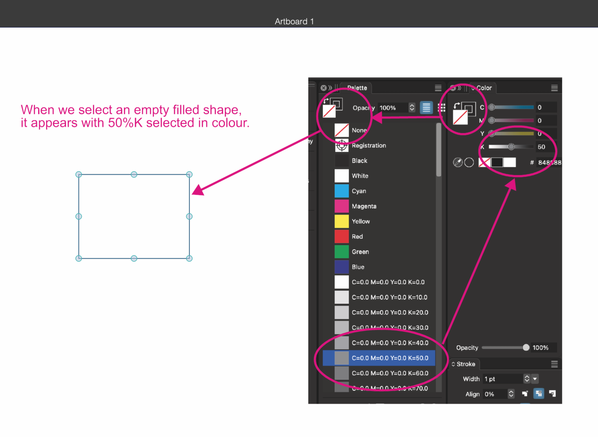 When we select a filled empty shape, 50%K appears in the selected colour.