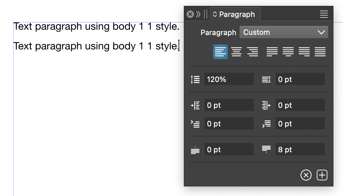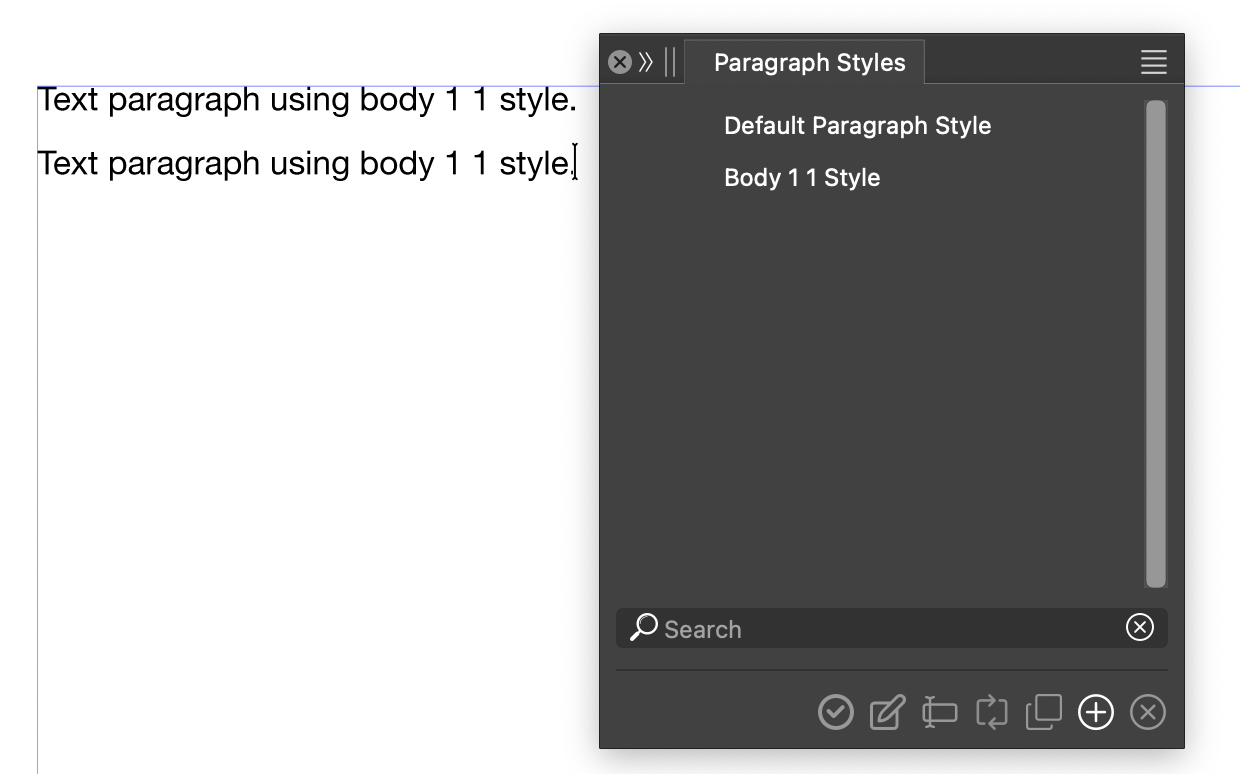 If you copy (CMD-C) and paste (CMD-V) that text paragraph below the existing text paragraph the associated text style is lost. Neither text paragraph is now associated with body 1 1 style and the paragraph style is not highlighted in the Paragraph Styles Panel (Screenshot 2).