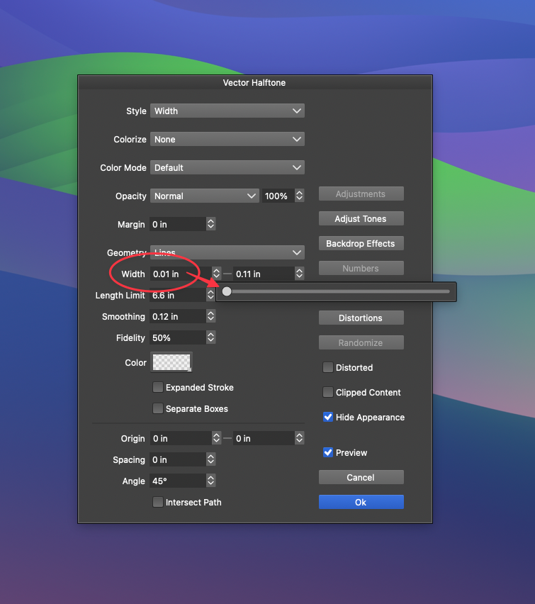 In the vector halftone options panel, when I am adjusting the width option using the scrubber, it will not allow me to get to total zero. It stops at "0.01". I have to go in and edit it manually to be at total zero.