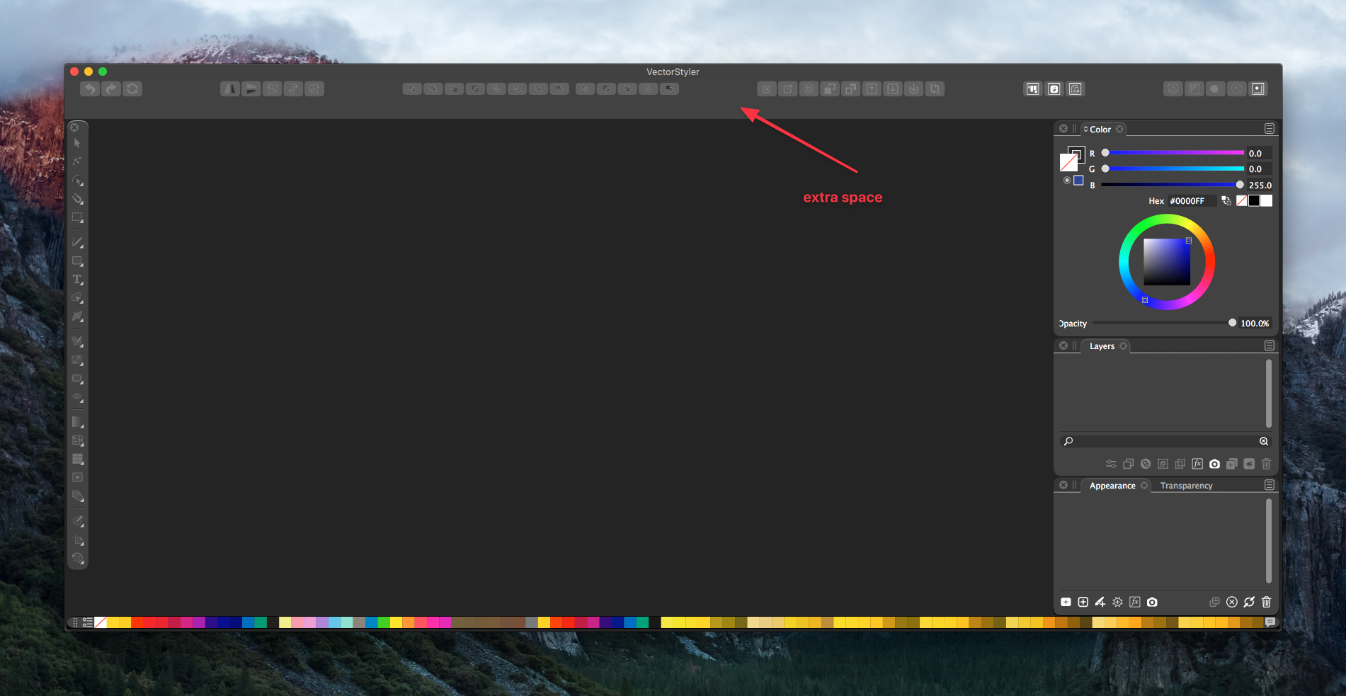 restart the app, and create a new document, draw a rectangle and select the transform tool (first in the box). Is there anything showing up in that region (under the button).