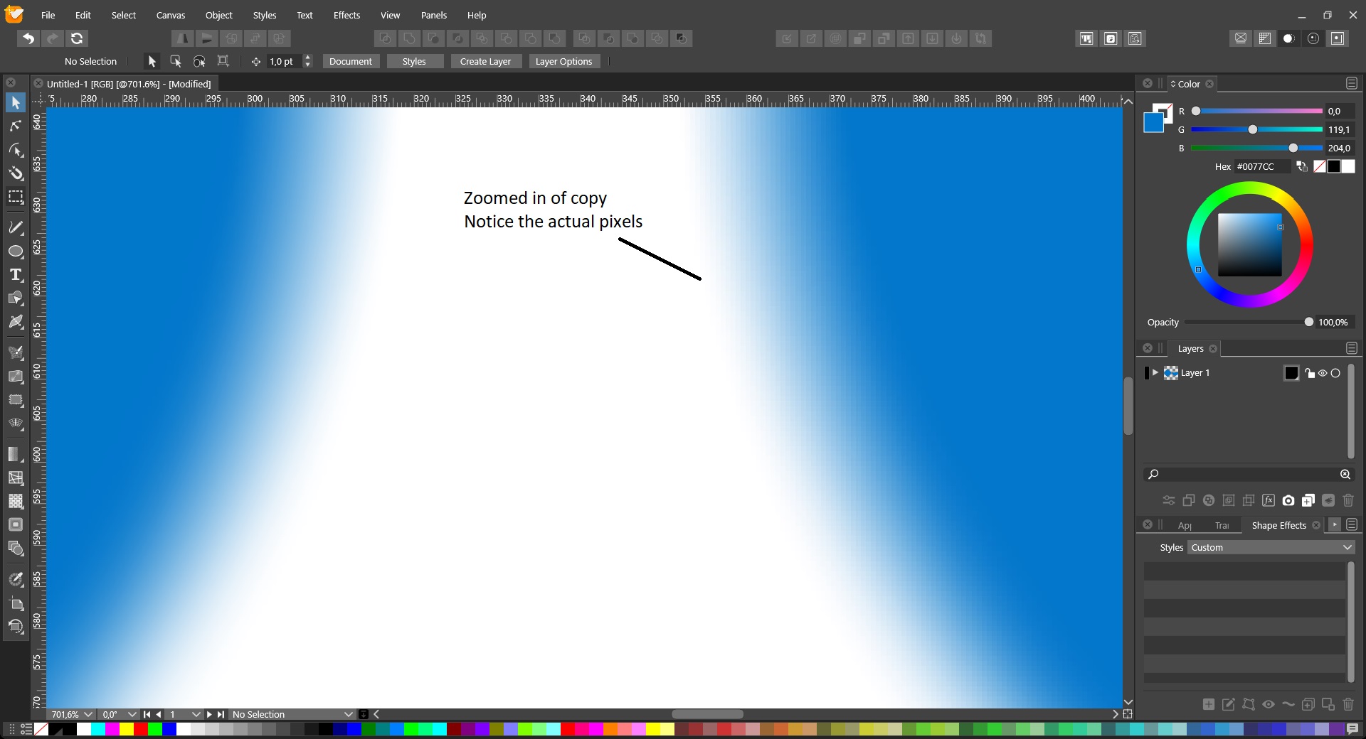 @gentlecl At higher zoom levels, some image effects will render at low resolution. This can be changed using the View -> Display -> Display Options -> Images -> Filter Precision field (50% by default, 100% means full resolution, but blur can be very slow).