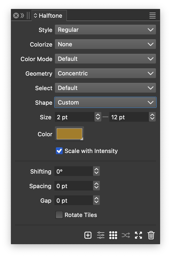 The Regular and Stippling halftone types use closed shapes for halftone dots. These shapes can be changed by the user to any shape from the canvas.