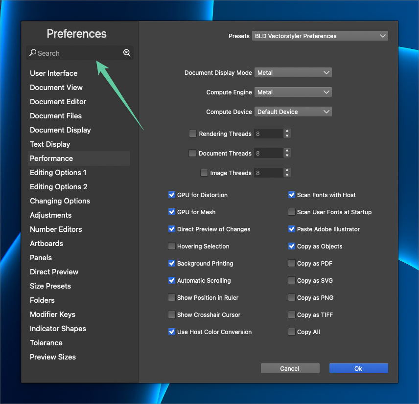Improving search options in Preferences