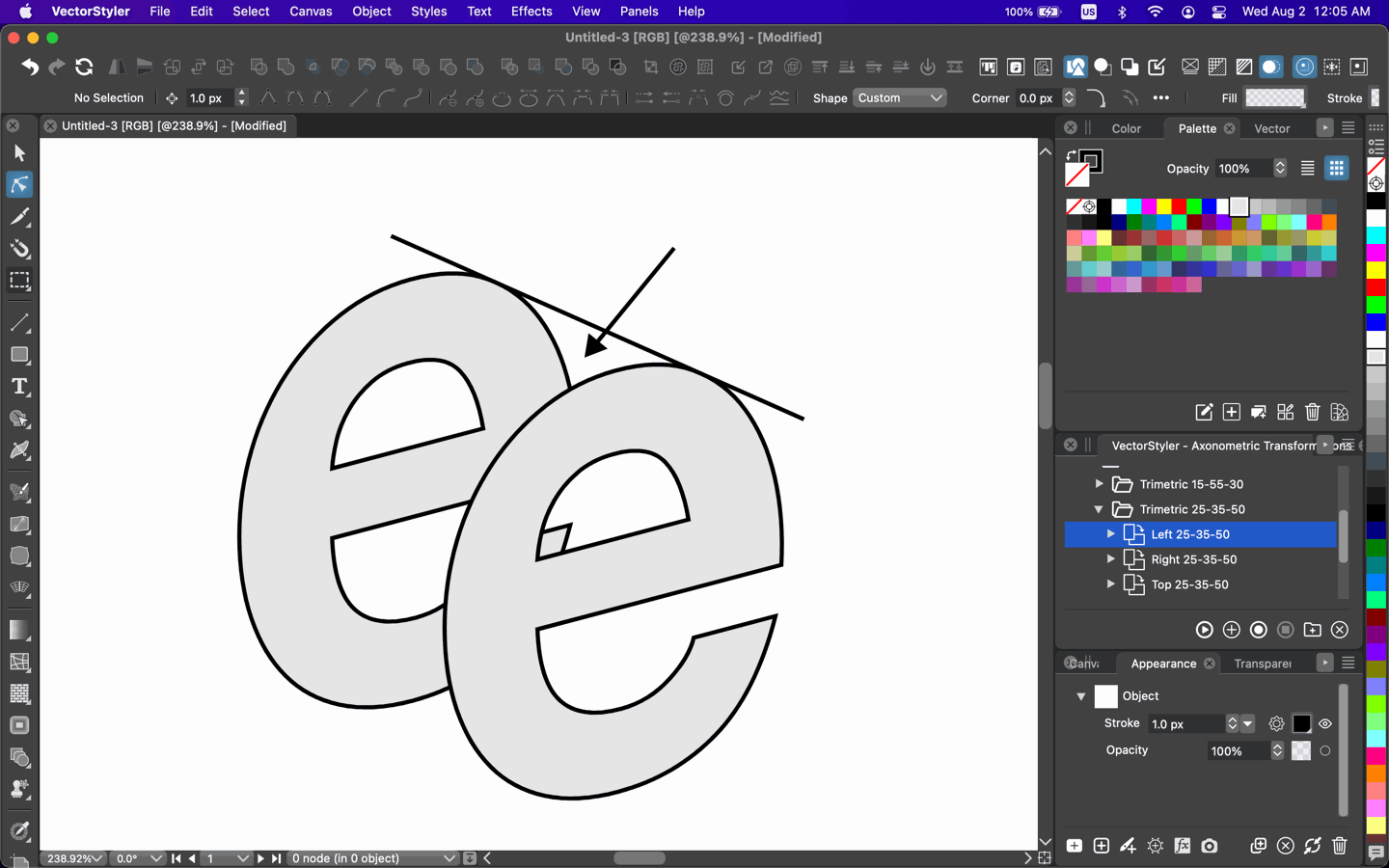 Look at the image below. There are 2 copies of the letter "e". They both rotated by the same amount.