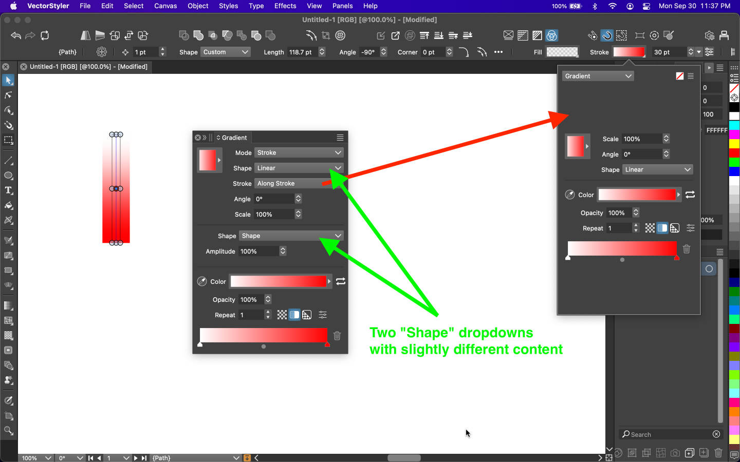 In addition, there are 2 "Shape" doprdowns in the Gradient Palette. I know the dropdown contents and the name "Shape" will change for the bottom "Shape" dropdown, depending on what is selected in the top "Shape" dropdown. I think that's a little confusing.