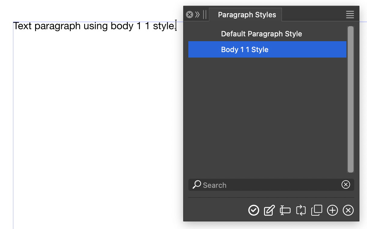 If you copy (CMD-C) and paste (CMD-V) that text paragraph below the existing text paragraph the associated text style is lost. Neither text paragraph is now associated with body 1 1 style and the paragraph style is not highlighted in the Paragraph Styles Panel (Screenshot 2).