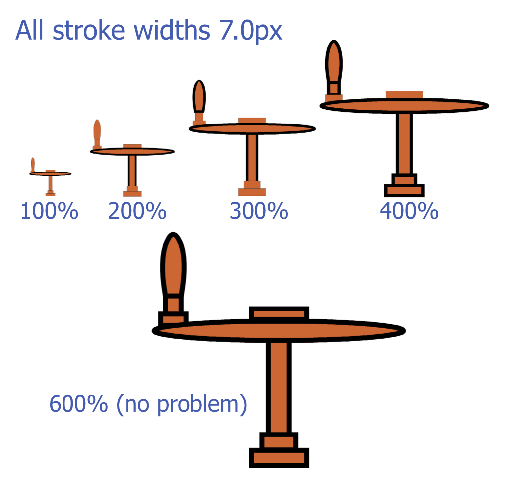 I've observed under some conditions that stroke widths and certain text characters do not display correctly at all zoom magnifications. It is particularly evident when using a large canvas, for example A3, with fairly small objects or using a comparatively small font size. Screenshots below.